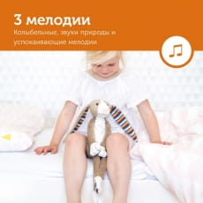 Когда малыш засыпает, может проигрывать 3 разные мелодии - колыбельные, успокаивающие мелодии и звуки природы.